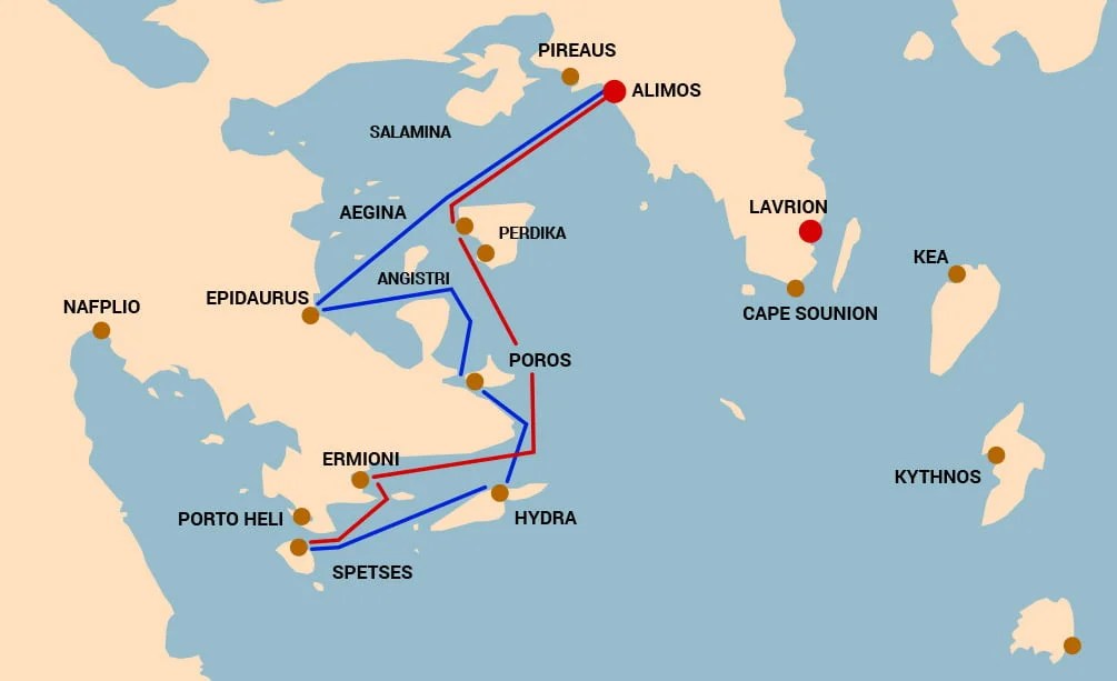 Zaczynamy w Atenach (sprawdź dojazd) 20 września. Jeszcze wieczorem zaprowiantowujemy jacht, przeprowadzamy odprawę bezpieczeństwa oraz krótkie szkolenie i z rana ruszamy ku Eginie, pierwszą noc prawdopodobnie spędzimy na Poros. Dokładna trasa zależy od warunków wiatrowych i będziemy ją dostosowywać względem aktualnych prognoz. W planie natomiast są: wyspy Zatoki Sarońskiej, Zatoka Argolidzka oraz przy dobrych wiatrach skok na Cyklady. Przykładowe trasy: